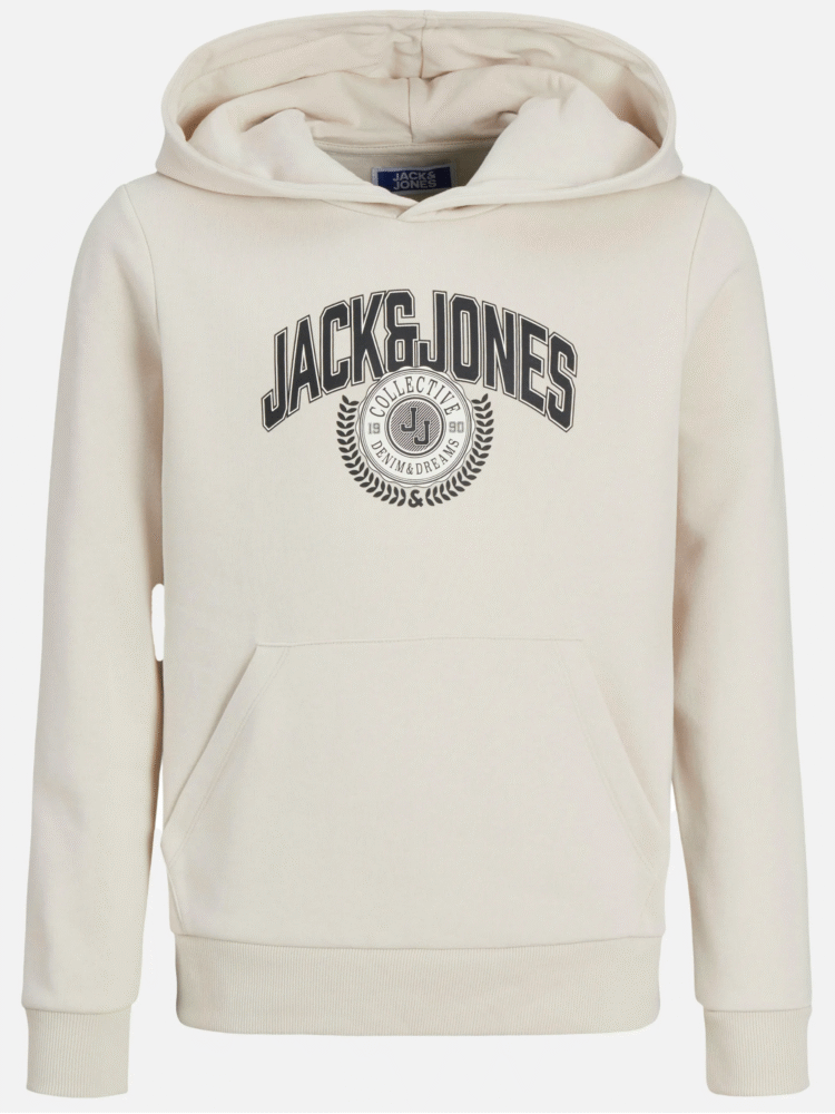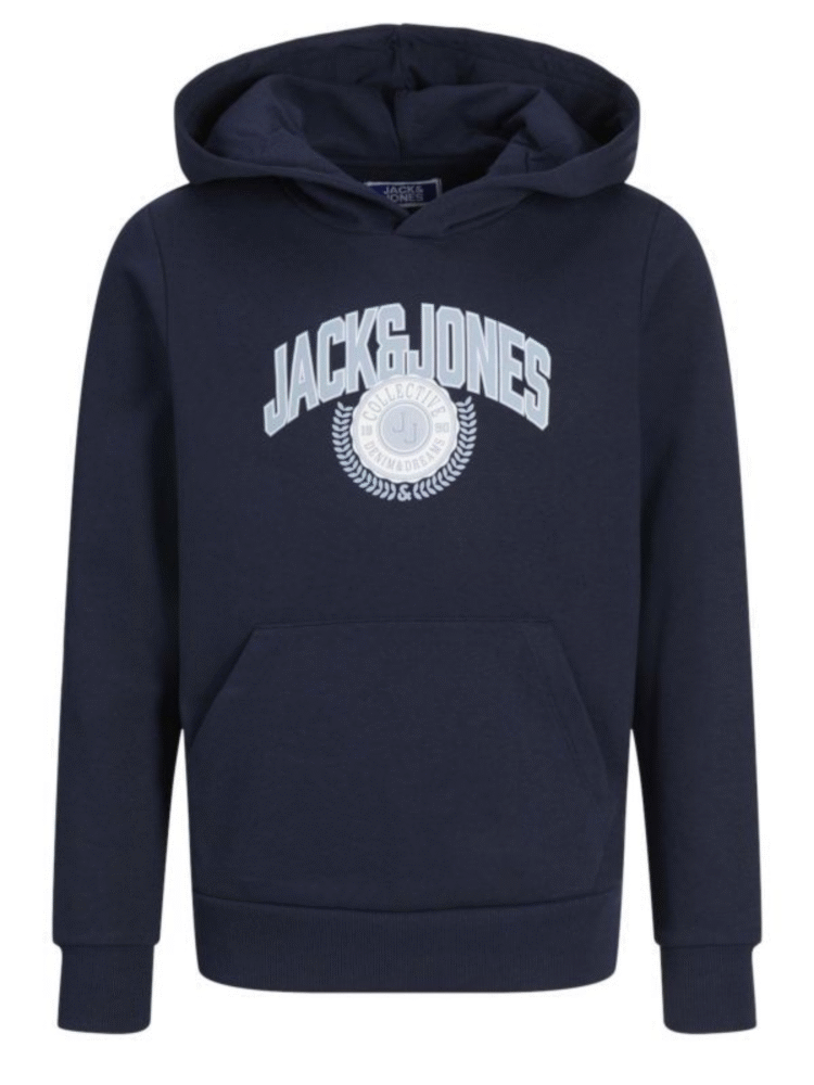 Sudadera con capucha de Jack & Jones Junior. Tejido fino y afelpado por dentro. Bolsillo tipo canguro y print con logo en el pecho. Puños y cintura elástica en canalé. Disponible en tres colores diferentes. Ideal para conseguir un outfit desenfadado esta vuelta al cole.